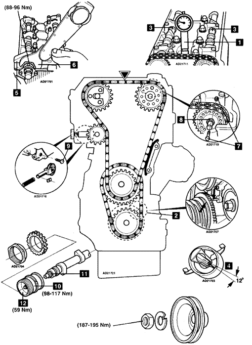 注意:螺母轴线上的拧紧力矩等于108-117Nm。 7.要调整排气凸轮轴正时标记的对齐,按照如下步骤进行: