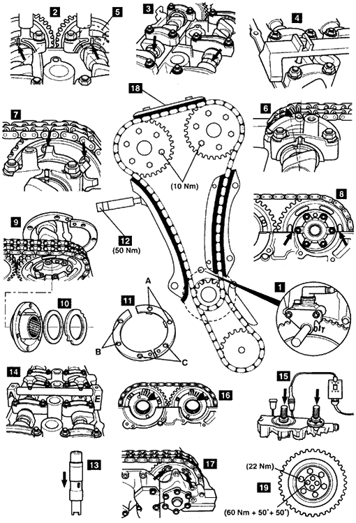 5.安装凸轮轴对准工具14。工具号11 7 341/2。 6.检查VANOS单元的功能。使用专用工具15。 7.在安装前及安装过程中,VANOS单元花键轴必须在“延迟”位置15。使用专用工具。 8.顺时针转动进气凸轮轴与排气凸轮轴上的花键毂,直到转不动为止(如图中16所示)。 9.用两个螺钉安装VANOS单元并将其固定到气缸盖上。 10.拧紧进气凸轮轴17与排气凸轮轴上的两个可接近的螺钉。拧紧力矩: 10牛顿·米。 11.拆下曲轴锁止销1。 12.转动曲轴并拧紧进排气凸轮轴上的固定螺钉。拧紧力矩: 10牛顿·米。 13.检查发动机是否在第一缸上止点位置。使用工具11 2 300/11 5 080。 14.安装上链条导板18。 15.安装固定螺钉并拧紧VANOS单元。 16.拧紧曲轴减震器毂螺栓19。拧紧力矩: 60牛顿·米+50°+ 50°。 注意:曲轴减震器毂螺栓必须只使用一次。 |