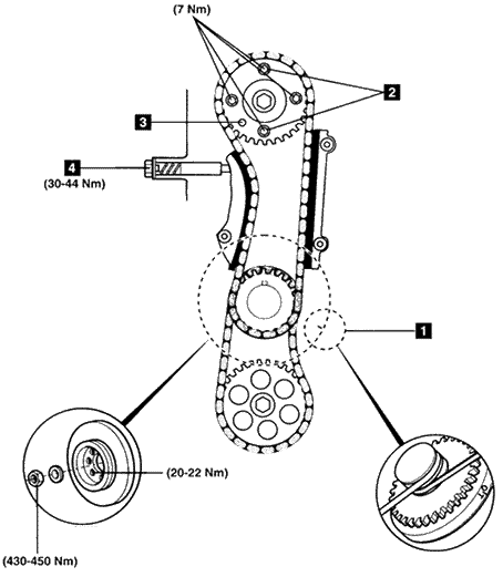 2.凸轮轴链轮螺纹孔垂直对正(见图中2)。