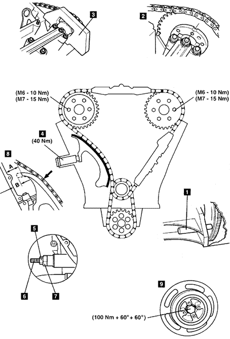 9.拧紧曲轴皮带轮中心螺栓9。拧紧力矩:100牛顿·米+60°+60°。 注意:曲轴皮带轮中心螺栓必须只能使用一次。 |