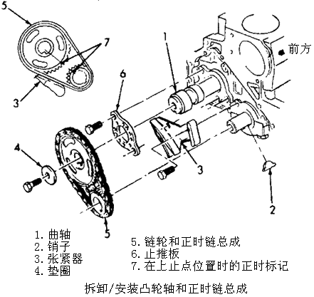 拆下前正时箱盖。对齐正时标记。见下图。拆下凸轮轴链轮螺栓,正时链和链轮。