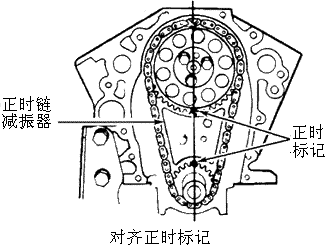 2.在凸轮轴链轮上安装正时链。在正时链垂下挂着的情况下保持凸轮轴链轮是垂直的。在曲轴链轮上安装正时链。将凸轮轴齿轮正时标记(锁止器孔的中心线)和正时链减振器顶部上的正时标记对齐。 3.使凸轮轴上的销子与凸轮轴链轮上的销孔对齐,把凸轮轴链轮安装在凸轮轴上。使用凸轮轴链轮固定螺栓完成凸轮轴链轮的安装。拧紧凸轮轴链轮固定螺栓到规定扭矩。用发动机油润滑正时链。按与拆卸步骤相反的顺序完成安装。 |