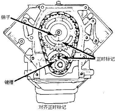 正时链 拆卸 1.断开蓄电池负极电缆。排干冷却系统。拆下空气滤清器、辅助驱动皮带和曲轴皮带轮。拆下右减振支撑到车身的支柱和冷却液储液罐。 2.拆下水泵。举升并支撑住汽车。拆下右前轮胎和空气导流板。 注意:当拆下曲轴减振器时可能有必要给一个气缸施加气压,以防止曲轴转动。 3.松开加热器旁通管并将它放在一边。拆下曲轴减振器螺栓和垫圈。将拉出器导向器(J-21052-4)装到曲轴减振器孔中。安装拉出器(J-38416)并拆下曲轴减振器。 4.拆下机油盘到前盖螺栓以及前盖到气缸体螺栓。拆下前盖和垫圈。记下挡油环的安装位置并从曲轴上拆下它。 5.转动曲轴直到正时标记与1号气缸在压缩行程的上止点位置对齐。从凸轮轴末端拆下止推轴承并抛弃。拆下凸轮轴链轮螺栓。同时从曲轴和凸轮轴上拆下正时链和链轮。见下图。