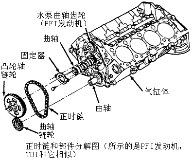 2.将凸轮轴链轮和正时链作为一个总成拆下。如果要更换曲轴链轮,使用链轮拆卸器(J-5825-A)将链轮从曲轴上拉下。见下图。