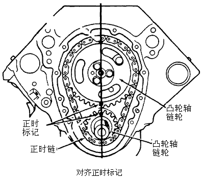 正时链 拆卸 1.断开蓄电池负极电缆。拆下前盖。转动曲轴,直到凸轮轴链轮和曲轴链轮正时标记与轴的中心在一条直线上。见下图。