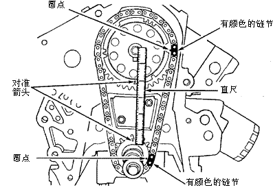 二、安装 安装正时链和链轮。使用直尺检查正时标记的对准。安装链轮螺栓并拧紧至规范。按与拆卸相反的顺序安装其余部件。