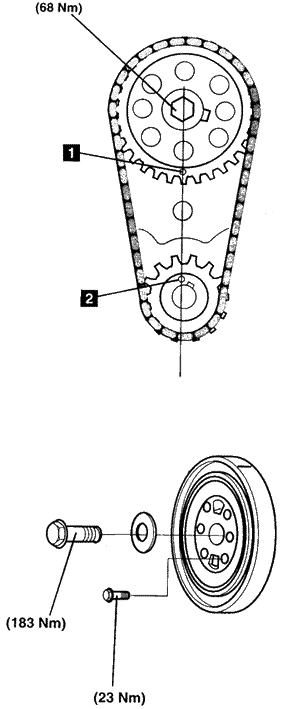 2.确保正时标记在曲轴和凸轮轴之间的中心线上相对(如图中1和2所示)。