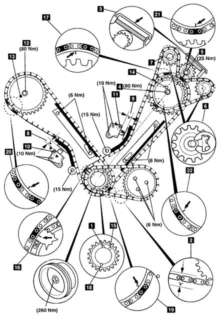 注意:使用平衡轴凸轮轴链轮上2个对称的正时标记中的任一个。 13.安装平衡轴链轮螺栓5。 14.转动平衡轴凸轮轴链轮与链条总成以使销钉14啮合。 15.安装前凸轮轴链轮螺栓4。拧紧力矩:80牛顿·米。在螺纹上涂抹螺纹防松剂。 16.拧紧平衡轴链轮螺栓5。拧紧力矩:25牛顿·米。在螺纹上涂抹螺纹防松剂。 17.安装张紧链轮卡簧6和7。 18.拆下平衡轴链条张紧器夹3。 19.安装油泵链轮与链条。拧紧力矩:6牛顿·米。在螺纹上涂抹螺纹防松剂。 20.安装曲轴带轮与螺母。拧紧力矩:260牛顿·米。在螺纹上涂抹螺纹防松剂。 注意:在正时链导轨和张紧器滑轨螺栓上涂抹螺纹防松剂。 |