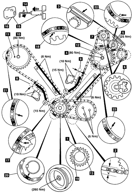 气门正时调整步骤 拆卸 1.在12点钟位置 1对齐曲轴键槽。 2.检查油泵链条的挠度‘X’(如图中2所示)。 注意:如果挠度‘X’超过7毫米,更换油泵链条并检查链轮是否磨损。 3.拆下油泵链轮与链条。 4.安装平衡轴链条张紧器夹3。 5.拆下前凸轮轴螺栓4。 6.拆下平衡轴链轮螺栓5。 7.拆下张紧链轮卡簧6和7。 8.拆下平衡轴链条和链轮。 9.拆下平衡轴链条张紧器夹3。 10.检查正时链张紧器的伸出部分‘X’ (8和9)。 注意:如果挠度‘X’超过9.5毫米,更换油泵链条并检查链轮是否磨损。 11.拆下张紧器。 注意:确保张紧器衬垫在拆卸过程中固定在正确位置。 12.拆下后凸轮轴链轮螺栓10。 13.拆下后凸轮轴链轮与链条。 14.拆下前凸轮轴链轮与链条。 注意:如果要重复使用正时链,把它们重新装配到原来的气缸盖上。 安装 1.对齐曲轴键槽在12点钟位置1。 2.确保凸轮轴销钉11和12如图所示对齐。 3.朝着前凸轮轴链轮螺栓对齐曲轴键槽13。 4.使用一个内六角扳手14,缩回前张紧器。 5.将张紧器活塞装进张紧器体,确保凹槽和孔对齐(如图中15所示)。 6.使用专用工具或一个小销子在图中16处锁紧张紧器。 7.重新安装前张紧器。拧紧力矩:10牛顿·米。 8.安装前正时链与凸轮轴链轮,确保标记的链节对齐: