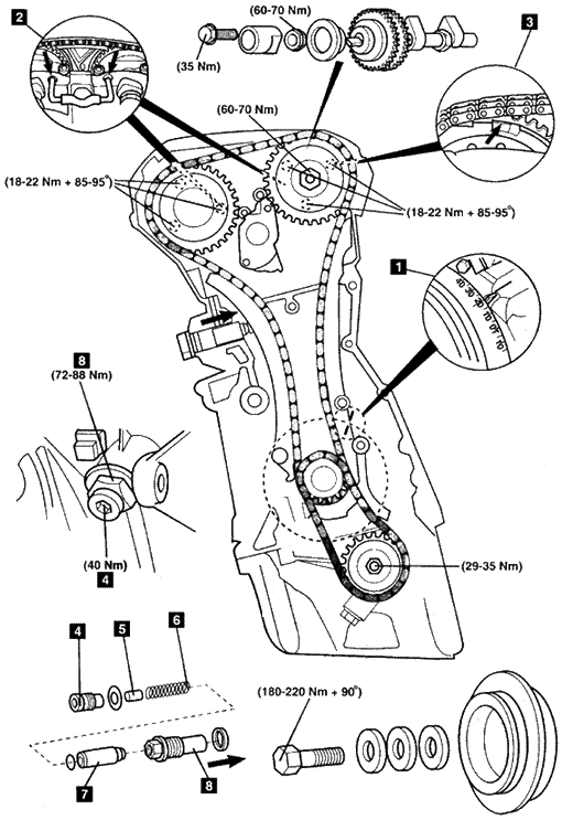 注意:进气凸轮轴调节器螺栓与排气凸轮轴链轮螺栓必须只用一次。 |