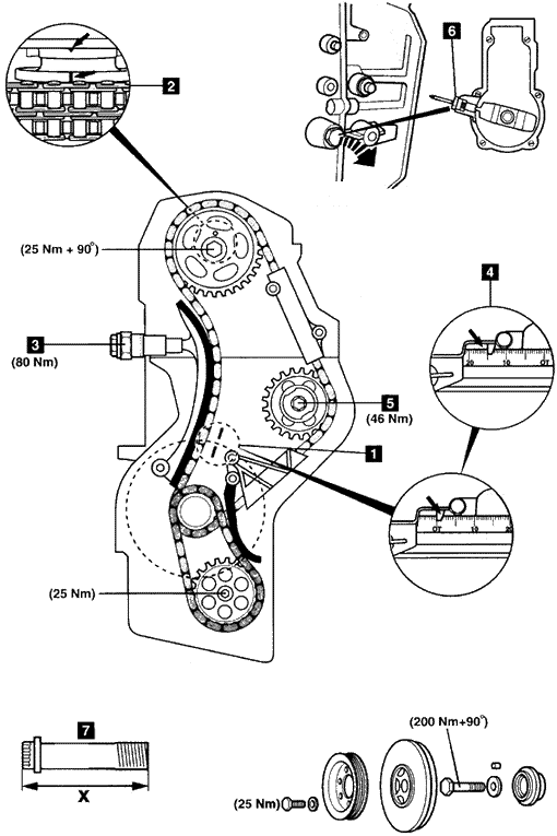 8.在维修后安装并拧紧张紧器3。拧紧力矩:80牛·米。 9.如果长度“X”超过53.6毫米,必须更换凸轮轴链轮螺栓7。 |