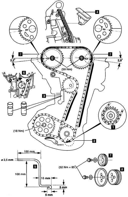 气门正时调整步骤 1.发动机在1号气缸上止点位置。 2.确保右凸轮轴链轮的正时标记与气缸盖的边缘成2.2度角。 3.确保左凸轮轴链轮的正时标记与气缸盖的边缘成2.9度角。 4.确保曲轴后链轮正时标记1在6点钟位置。 5.将铜色链节与链轮标记对正2。 6.确保正时链在非张紧侧的链轮之间是紧绷的。 7.总是安装新的柱塞3。 8.安装新的上部链条导轨4。 9.由于难以接近,用专用工具5拉开柱塞。 10.释放张紧器6。