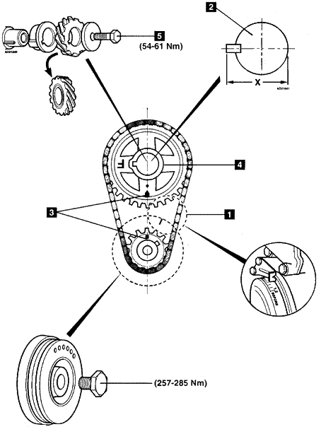 气门正时调整步骤 1.确保曲轴在1缸上止点 1。 注意:凸轮轴键槽与链轮之间的间隙为分电器驱动齿轮提供润滑油。 警告:确保凸轮轴键槽是平行的并且‘X’(如图中2所示)不超过30.15毫米。 2.安装正时凸轮轴链轮与正时链,确保标记3对齐。 注意:确保凸轮轴链轮上的‘F’标记4背对气缸体。 3.安装分电器驱动齿轮,确保环形槽对着气缸体(如图中5所示)。拧紧力矩:54-61牛顿·米。 |