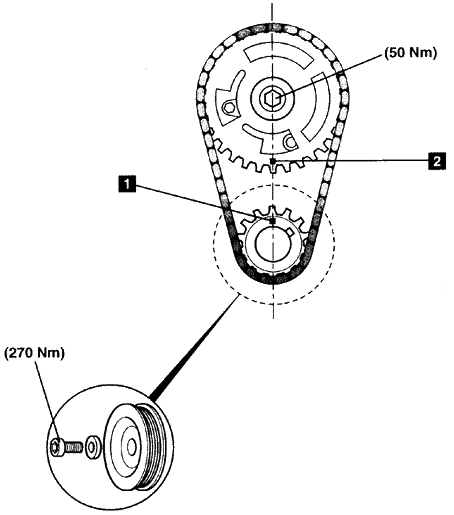 4.安装凸轮轴链轮与正时链,确保正时标记1和2对齐。