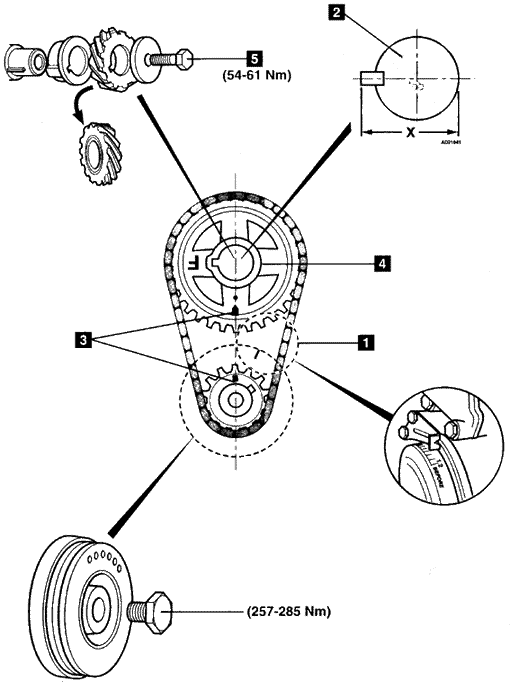 气门正时调整步骤 1.确保曲轴在1缸上止点1。 注意:凸轮轴键槽与链轮之间的间隙为分电器驱动齿轮提供润滑油。 警告:确保凸轮轴键槽是平行的并且‘X’(如图中2所示)不超过30.15毫米。 2.安装正时凸轮轴链轮与正时链,确保标记3对齐。 注意:确保凸轮轴链轮上的‘F’标记4背对气缸体。 3.安装分电器驱动齿轮,确保环形槽对着气缸体(如图中5所示)。拧紧力矩:54-61牛顿·米。 |