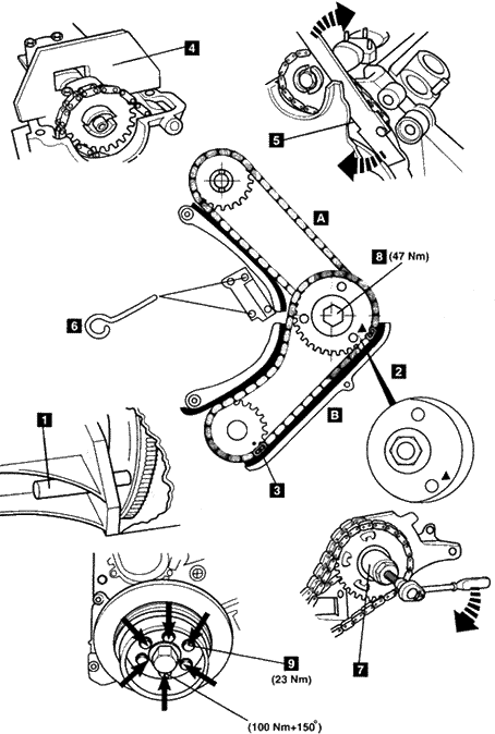 气门正时调整步骤 1.发动机在1缸上止点。 2.插入飞轮正时销1。工具号12-108。 3.对齐喷油泵链轮正时标记和正时链白色链节 2。 4.对齐曲轴链轮正时标记与白色链节 3。 5.安装凸轮轴对齐工具4。工具号12-112。 6.压入正时链张紧器5。使用工具12-115。 7.在张紧器内插入锁紧销6。工具号12-114。 8.拆下喷油泵链轮7。使用工具12-119。 9.将喷油泵链轮螺母8拧紧至47牛顿·米。 10.将曲轴减震器螺栓9拧紧至23牛顿·米。 11.A:80个链节。B:74个链节。 |