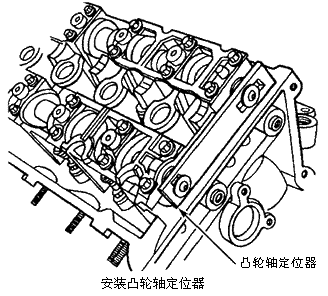 3)将凸轮轴定位器(T93P-6256-A)安装到凸轮轴后部(需要装备两个)。见下图。拆下右初级正时链张紧器,拆下螺栓和右链条张紧臂。拆下3个螺栓和右链条导向装置。