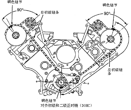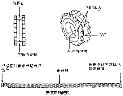 4)如果在正时链上看不到铜色的链节,将正时链对折并按正时要求标记标记两个端部链节。见上图。这些链节在安装时将被作为铜色的链节。 5)确保1号气缸在上止点。这将使曲轴键槽定位在与垂直方向成45°的位置。曲轴键槽应该指向凸轮轴。 6)在凸轮轴链轮和曲轴链轮上安装左正时链,使铜色链节与链轮上正时标记对准。见下图。安装右正时链的曲轴链轮。确保链轮正确安装。
