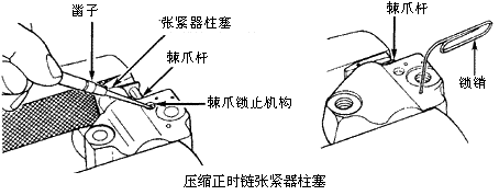 7)在凸轮轴链轮和曲轴链轮上安装右正时链,使铜色链节与链轮上正时标记对准。在曲轴端安装曲轴定位器(T93P-6303-A)。用发动机油润滑张紧臂并安装张紧臂。安装链条导向装置。 8)链条张紧器中的气体必须被排空,以便安装前将张紧器柱塞压进壳体。将链条张紧器放在一个软口虎钳内。用小凿子将棘爪锁止机构从棘爪杆撬离并卡住。见下图。慢慢合上虎钳以压入张紧器柱塞。