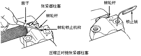 3.安装左正时链的曲轴链轮。如果正时链上的铜色链节不可见,对半折叠正时链并标记末端链节以便调整正时。见上图。这些链节在安装时将被做为紫铜色的链节来参考。 4.确保1号活塞在上止点位置。这将使曲轴键槽离开垂直位置45°。曲轴键槽将指向凸轮轴。 5.在凸轮轴链轮和曲轴链轮上安装左正时链,并使铜色的链节与链轮上的正时标记对齐。参见“识别正时标记”图。安装右正时链的曲轴链轮。确保链轮被正确地安装。 6.在凸轮轴链轮和曲轴链轮上安装右正时链,并使铜色的链节与链轮上的正时标记对齐。安装曲轴位置调节器(T93P-6303-A)以防止曲轴转动。用发动机油润滑张紧器臂。安装张紧器臂。安装正时链导套。 7.在安装前,必须对正时链张紧器进行排气,以使张紧器柱塞被压到壳体中。将正时链张紧器放在软爪虎钳中。用小凿子将棘齿锁止机构撬离棘齿杆。见下图。慢慢地合拢夹钳以压缩张紧器柱塞。 8.当张紧器柱塞被压到张紧器壳中时,继续保持住棘齿锁止机构并在张紧器柱塞腔的小孔中安装锁止销。在安装锁止销之前确保棘齿杆与张紧器柱塞壳体相平。见下图。