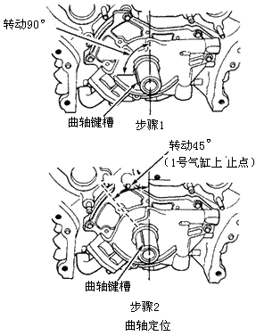 拆卸 注意:在拆下正时链的情况下不要转动发动机。否则可能导致气门/活塞损坏。 1.拆下气门罩。拆下前盖。从曲轴上拆下曲轴位置传感器脉冲信号轮。 2.转动曲轴,使1号活塞在上止点位置。这将使曲轴键槽离开垂直位置45°。见下图。凸轮轴键槽将指向曲轴。