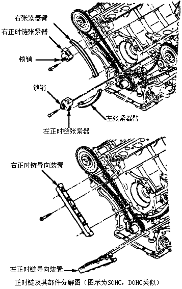 一、拆卸 小心:拆下正时链时不要转动发动机。否则可能损坏气门/活塞。 SOHC 1)拆下凸轮轴盖。释放燃油压力,断开左燃油管以拆下左凸轮轴盖。 2)拆下前盖。从曲轴上拆下曲轴传感器轮。转动发动机,使1号气缸在上止点。这将使曲轴键槽离开垂直位置45°。凸轮轴键槽应该指向曲轴。