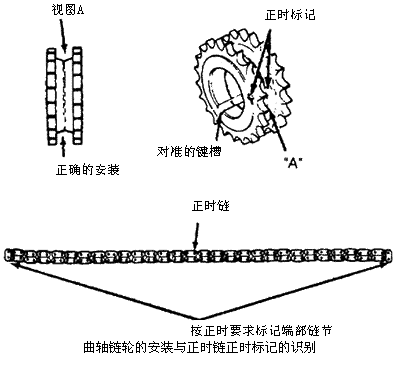 3)对右气缸盖重复步骤1和2)。安装右曲轴链轮。确保曲轴链轮安装正确。 4)如果在正时链上看不到铜色的链节,将正时链对折并按正时要求标记端部链节。这些链节在安装时将被作为铜色的链节。 5)确保1号气缸在上止点。这将使曲轴键槽离开垂直位置45°。曲轴键槽应该指向凸轮轴。 6)在凸轮轴和曲轴链轮上安装左正时链,使铜色链节与链轮上正时标记对准。安装右正时链的曲轴链轮。确保链轮正确安装。