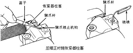 3)安装左正时链的曲轴链轮。如果在正时链上看不到铜色的链节,将正时链对折并按正时要求标记端部链节。这些链节在安装时将被作为铜色的链节。 4)确保1号气缸在上止点。这将使曲轴键槽离开垂直位置45°。曲轴键槽应该指向凸轮轴。(参见“对齐凸轮轴和曲轴正时标记”图) 5)在凸轮轴链轮和曲轴链轮上安装左正时链,使铜色链节与链轮上的正时标记对准。安装右正时链的曲轴链轮。确保链轮正确安装。见上图。 6)在凸轮轴和曲轴链轮上安装右正时链,使铜色链节与链轮上正时标记对准。在曲轴端安装曲轴定位器(T93P-6256-A)。用发动机油润滑张紧器臂并安装张紧器臂。安装导向装置。 7)链条张紧器中的气体必须被排空,以便安装前将张紧器柱塞压进壳体。将链条张紧器放在一个软口虎钳内。用小凿子将棘爪锁止机构从棘爪杆撬离并卡住。慢慢合上虎钳以压入张紧器柱塞。见下图。