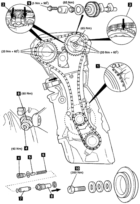 9.风扇的粘性联轴器螺母是左旋螺纹。 注意:进气凸轮轴调节器螺栓和排气凸轮轴链轮螺栓必须只能用一次。 注意:进气凸轮轴调节器架螺栓9必须只用一次。 10.在装配过程中润滑曲轴皮带轮中心螺栓和垫圈。 11.拧紧曲轴皮带轮螺栓10。 |