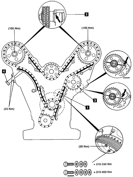 气门正时调整步骤 1.确保发动机在1号气缸的上止点位置1。 2.确保两个凸轮轴上的正时标记2对齐。 3.确保分电器驱动链轮正时标记3对齐。 4.在进行发动机修理之前,拆下张紧器总成4。 5.在安装前,向正时链张紧器加注机油。