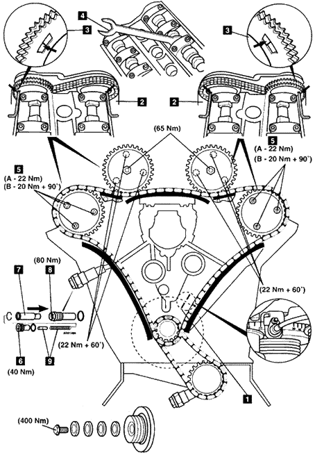 气门正时调整步骤 注意:正时链能够在不拆卸发动机的情况下被更换。使用专用工具将新正时链连接到旧正时链上,绕过链轮,然后再连接到一起。 1.将发动机置于1号气缸的上止点位置1。 2.将一个直径是4毫米的销子2插入到凸轮轴中。 3.在正时链安装过程中,确保进气凸轮轴调整器凸起在“延迟”位置,见3。 警告:如果装配不正确,可能会发生气门与活塞的接触。 4.可以使用扳手4防止凸轮轴转动。 注意:当曲轴被设定在1号气缸的上止点后30°位置时,凸轮轴能够被转动且气门不接触活塞。 5.排气凸轮轴链轮螺栓5的识别和拧紧力矩: