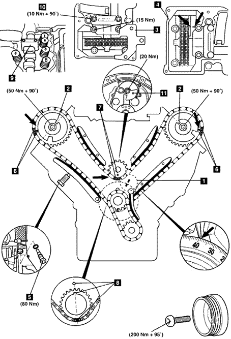 注意:在安装完后,每经过14圈铜色的正时链节都会正好对正。 7.要更换正时链,请按照下面所述进行: