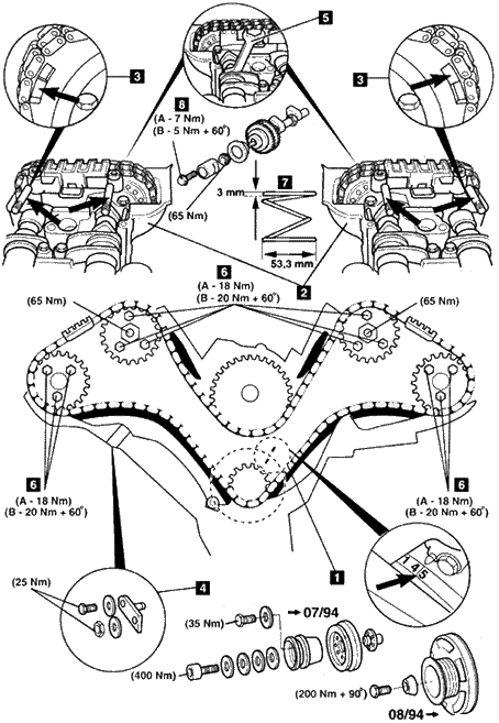 注意:在维修过程中,A类应该用B类来更换。B类只能使用一次。 9.→1994.7:在装配过程中润滑曲轴皮带轮中心螺栓和垫圈。 |