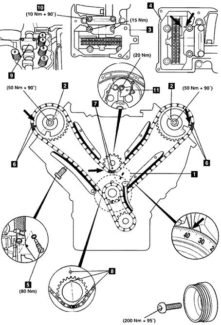 注意:在安装完后,每经过14圈铜色的正时链节都会正好对正。 7.要更换正时链,请按照下面所述进行: