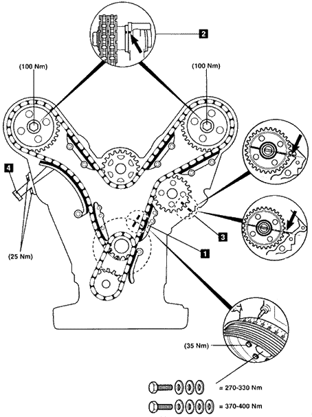 气门正时调整步骤 1.确保发动机在1号气缸的上止点位置1。 2.确保两个凸轮轴上的正时标记2对齐。 3.确保分电器驱动链轮上的正时标记3对齐。 4.在进行发动机修理之前,拆下张紧器总成4。 5.在安装前,向正时链张紧器加注机油。