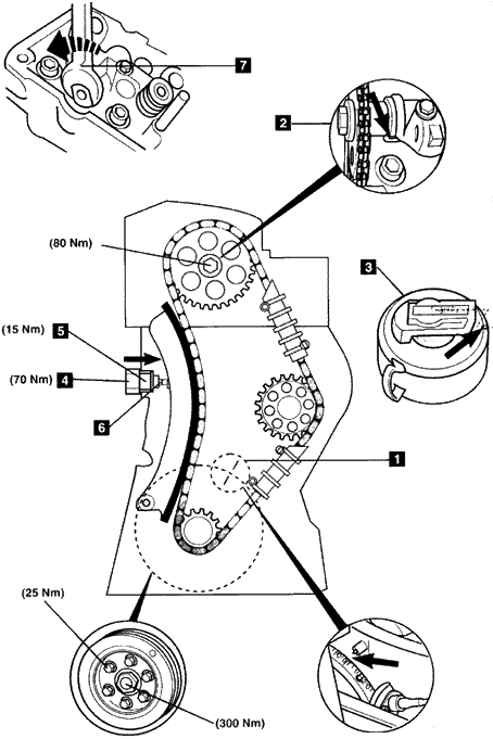 气门正时调整步骤 注意:正时链能够在不拆卸发动机的情况下被更换。使用专用工具,可以将新正时链连接到旧正时链上,绕过链轮,然后再连接到一起。 1.早期的发动机安装的是单正时链。 2.早期的单正时链采用组合链节实现连接。 3.单正时链传动能够被改进成复式正时链传动。 注意:改进时需要拆卸气缸盖。 4.1988年1月以后的车型安装复式正时链。 5.使发动机处于1号气缸的上止点位置1。 6.确保凸轮轴正时标记与气缸盖对齐,见2。 7.确保分火头臂与分电器上的1号气缸标记对齐,见3。 8.在进行发动机修理之前,请拆下张紧器总成4、5、6。 注意:通过弹簧给盖形螺母4施加预紧力。 9.使用24毫米扳手7能防止凸轮轴转动。 10.在修理完后安装张紧器: