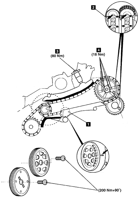 气门正时调整步骤 注意:正时链能够在不拆卸发动机的情况下被更换。使用专用工具,可以将新正时链连接到旧正时链上,绕过链轮,然后再连接到一起。 1.将发动机和副车架做为一个总成拆下来。 2.使发动机在1号气缸的上止点位置1处。 3.将直径为6毫米的销子2插入到凸轮轴的链轮中。 注意:销子应该靠着气缸盖的上边缘。 4.在修理发动机之前,拆下张紧器总成3。 5.凸轮轴链轮螺栓4只能使用一次。 6.在修理完发动机后请安装张紧器。拧紧力矩:80Nm。 |