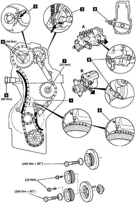 气门正时调整步骤 注意:正时链能够在不拆卸发动机的情况下被更换。使用专用工具将新正时链连接到旧正时链上,绕过链轮,然后再连接到一起。 1.将发动机转动到1号气缸的上止点位置1处。 2.将锁止销2插入到进气凸轮轴中。 3.确保凸轮轴链轮上的1.5毫米小孔对齐,见3。 4.凸轮轴链轮螺栓4必须只使用一次。 5.在进行发动机修理之前,拆下张紧器总成5。 6.在拆卸/安装喷油泵的过程中:将曲轴位置设定到1号气缸的上止点后14+0.5°处,见6。 注意:喷油泵链轮螺栓/螺母7是左旋螺纹。 7.在拆下螺栓7之前安装喷油泵链轮对中工具。工具号为601589051400。 8.在拆下喷油泵之后,安装锁止工具8。 9.在安装前,向正时链张紧器加机油: