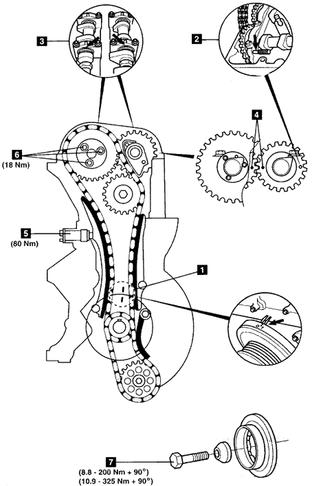 气门正时调整步骤 注意:正时链能够在不拆卸发动机的情况下被更换。使用专用工具可以将新正时链连接到旧正时链上,然后绕过链轮连接到一起。 1.将发动机转动到1号气缸的上止点位置1处。 2.将锁止销2插入到进气凸轮轴中。 3.确保凸轮轴正时标记3和4都对齐。 4.在进行发动机修理之前,拆下张紧器总成5。 5.凸轮轴链轮螺栓6只能使用一次。 6.在修理完发动机后,安装张紧器5。拧紧力矩:80Nm。 7.拧紧曲轴皮带轮螺栓7。