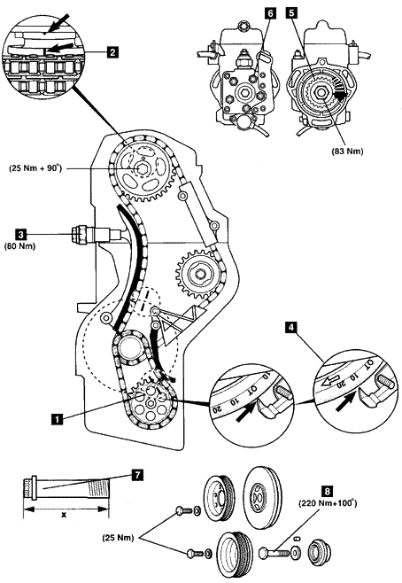 7.修理完后,安装张紧器3。拧紧力矩:80Nm。 8.如果凸轮轴链轮螺栓7的长度‘X’超出53.6毫米的范围,必须进行更换。 9.曲轴皮带轮中心螺栓只能使用一次。 |