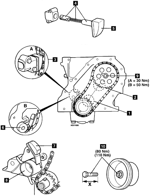 14.拧紧曲轴链轮螺栓10如下: 螺栓长度X=40mm。拧紧力矩:80牛顿米。 螺栓长度X=45mm。拧紧力矩:110牛顿米。 |