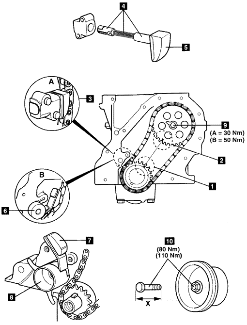 14.拧紧曲轴链轮螺栓10如下: 螺栓长度X=40mm。拧紧力矩:80牛顿米。 螺栓长度X=45mm。拧紧力矩:110牛顿米。 |