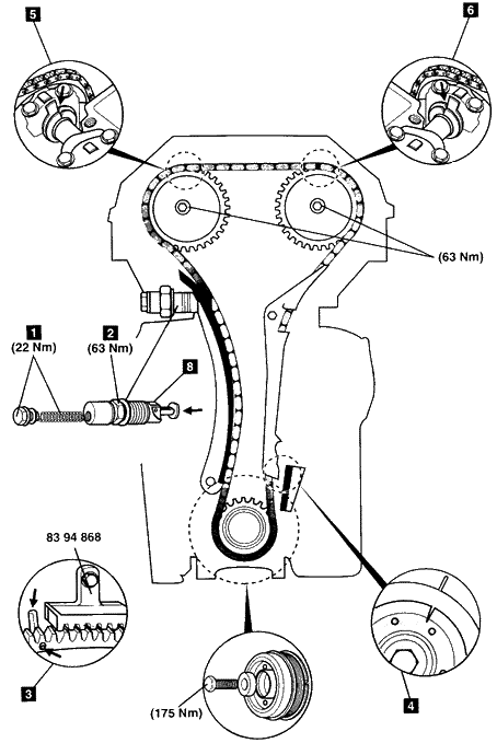 2.拆下正时链盖以前,拆下正时链张紧器1和2。 3.确保曲轴在上止点(如图中3和4所示)。 4.用锁止工具83 94 868锁止飞轮/驱动盘。 5.确保凸轮轴正时标记5、6对准。 6.安装正时链盖、机油盘和气缸盖以后安装正时链张紧器: