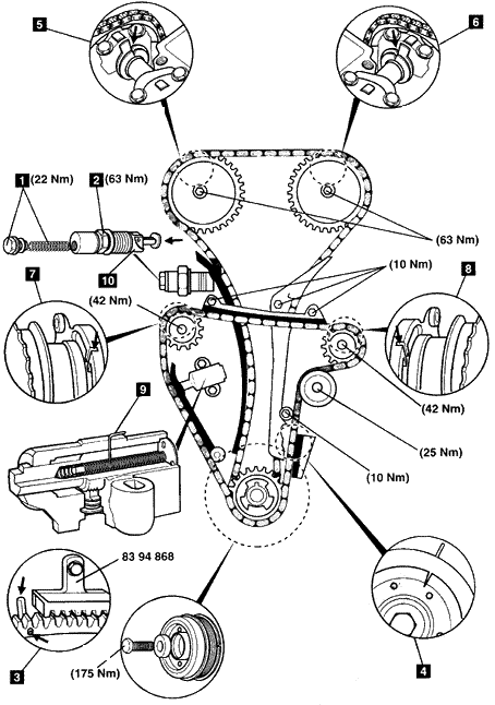 2.拆下正时链盖以前拆下正时链张紧器1和2。 3.确保曲轴在上止点(如图中3和4所示)。 4.用锁止工具83 94 868锁止飞轮/驱动盘。 5.确保凸轮轴正时标记5、6对准。 6.确保平衡轴正时标记7、8对准。 7.安装期间缩回平衡轴链张紧器并用一个细销9锁紧。 8.安装正时链盖、机油盘和气缸盖以后安装正时链张紧器: