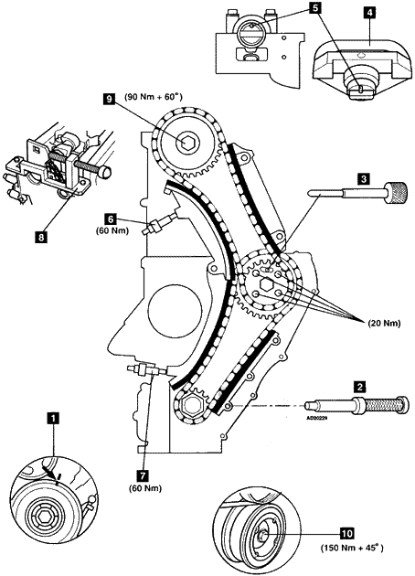 11.确保喷油泵锁销在任何时候都能轻松移动。 12.装配新的凸轮轴链轮螺栓9。拧紧力矩:90牛顿米+60°。 13.安装正时链后安装正时链张紧器6和7。拧紧力矩:60牛顿米。 14.装配新的曲轴皮带轮螺栓10。拧紧力矩:150牛顿米+45°。 |
