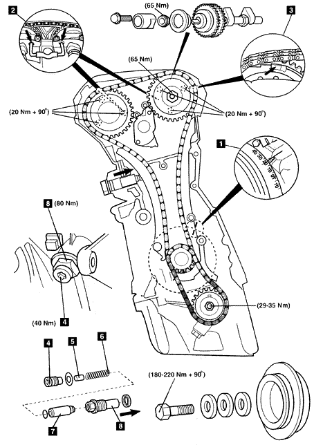 气门正时调整步骤 注意:正时链可以在不拆卸发动机的情况下更换,使用专用工具可以在组合链节处把新链条连接到旧链条上,然后绕过链轮连接在一起。 1.发动机处于1号气缸上止点后20°的位置,如图中1所示。 2.确保1号气缸2个凸轮轴上的凸轮凸角向上。 3.在凸轮轴上安装锁止工具2。 4.在正时链的安装过程中,确保凸轮轴调节器的凸起在“Retarded”(延迟)位置,如图中3所示。 警告:如果安装不正确,可能发生气门与活塞的接触。 5.当曲轴设置在1号气缸上止点后20°的位置时,凸轮轴能够转动并且气门不接触活塞。 6.在进行发动机修理前: