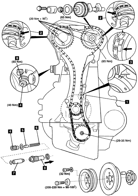 气门正时调整步骤 注意:正时链可以在不拆卸发动机的情况下更换,使用专用工具可以在组合链节处把新链条连接到旧链条上,然后绕过链轮连接在一起。 1.发动机处于1号气缸上止点的位置,如图中1所示。 2.把直径为4mm的销插入到凸轮轴中,如图中2所示。 3.在正时链的安装过程中,确保凸轮轴调节器的凸起在“Retarded”(延迟)位置,如图中3所示。 警告:如果安装不正确,可能发生气门到活塞的接触。 4.当曲轴设置在1号气缸上止点前30°的位置时,凸轮轴能够转动并且气门不接触活塞。 5.在进行发动机修理前: