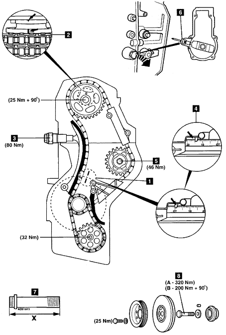 8.在修理后安装张紧器总成3。拧紧力矩:80Nm。 9.如果长度“X”超过53.6mm,必须要更换凸轮轴链轮螺栓7。 10.拧紧曲轴皮带轮螺栓8: