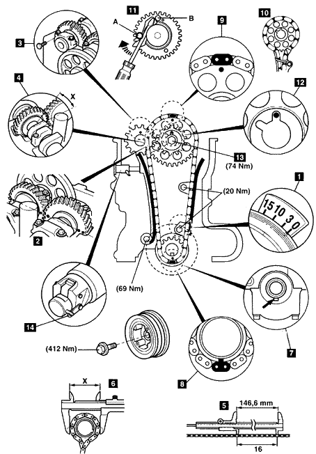 9.检查正时链导轨是否磨损:最大1.0毫米。 10.对齐曲轴键槽到6点钟位置,见7。 11.安装正时链,确保被标记的正时链节对齐8和9。 12. 将正时链固定到凸轮轴链轮上,见10。13.安装正时链盖和机油盘。 14.安装气缸盖。 15.如果排气凸轮轴齿轮已经被拆下: