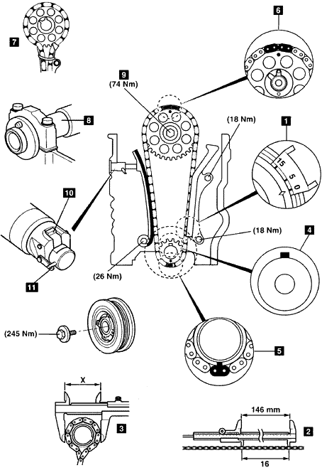 5.检查正时链导轨是否磨损:最大1.0毫米。 6.使曲轴键槽对齐12点钟位置,见4。 7.安装正时链,确保被标记的正时链节对齐,见5和6。 8.将正时链固定到凸轮轴链轮7上。 9.安装正时链盖和机油盘。 10.确保凸轮轴定位销在12点钟位置,见8。 11.安装气缸盖。 12.安装凸轮轴链轮螺栓9。拧紧力矩:74Nm。 13.缩回正时链张紧器10并使固定销11啮合。 14.安装正时链张紧器。 注意:在安装期间,正时链张紧器固定销将脱开。 |